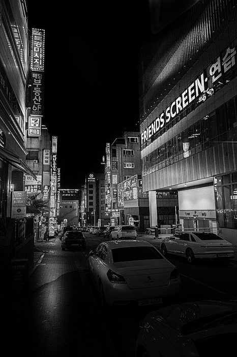 A night scene captures a bustling street lined with illuminated signs and commercial buildings. Various cars are parked along the side of the road,... more
